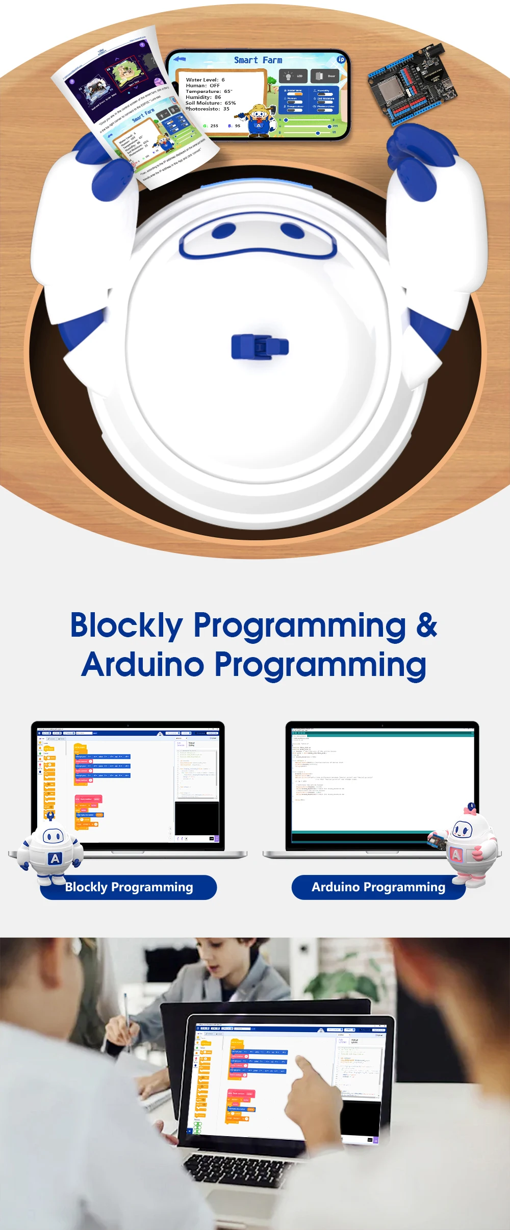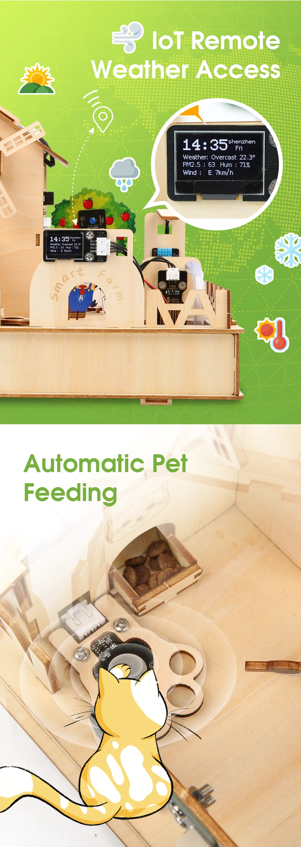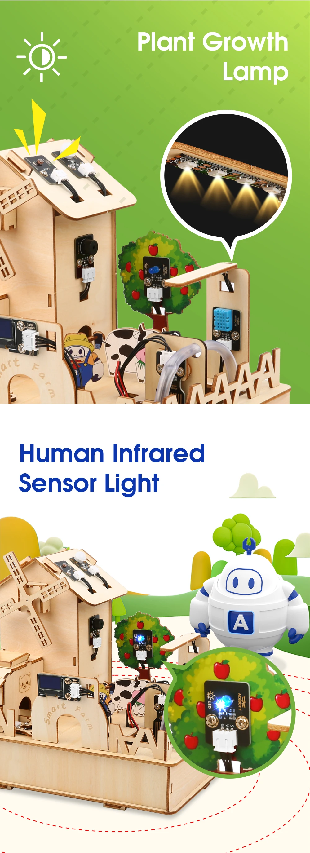 La Ferme Intelligente est un kit d'apprentissage de la programmation conçu pour les débutants. Vous pouvez programmer la carte contrôleur ESP32 pour réaliser diverses fonctions telles que des lumières à détection infrarouge humaine, des bandes LED à commande lumineuse, des systèmes d'arrosage automatique, des distributeurs pour animaux de compagnie, l'accès aux informations météorologiques via l'Internet des objets, etc.